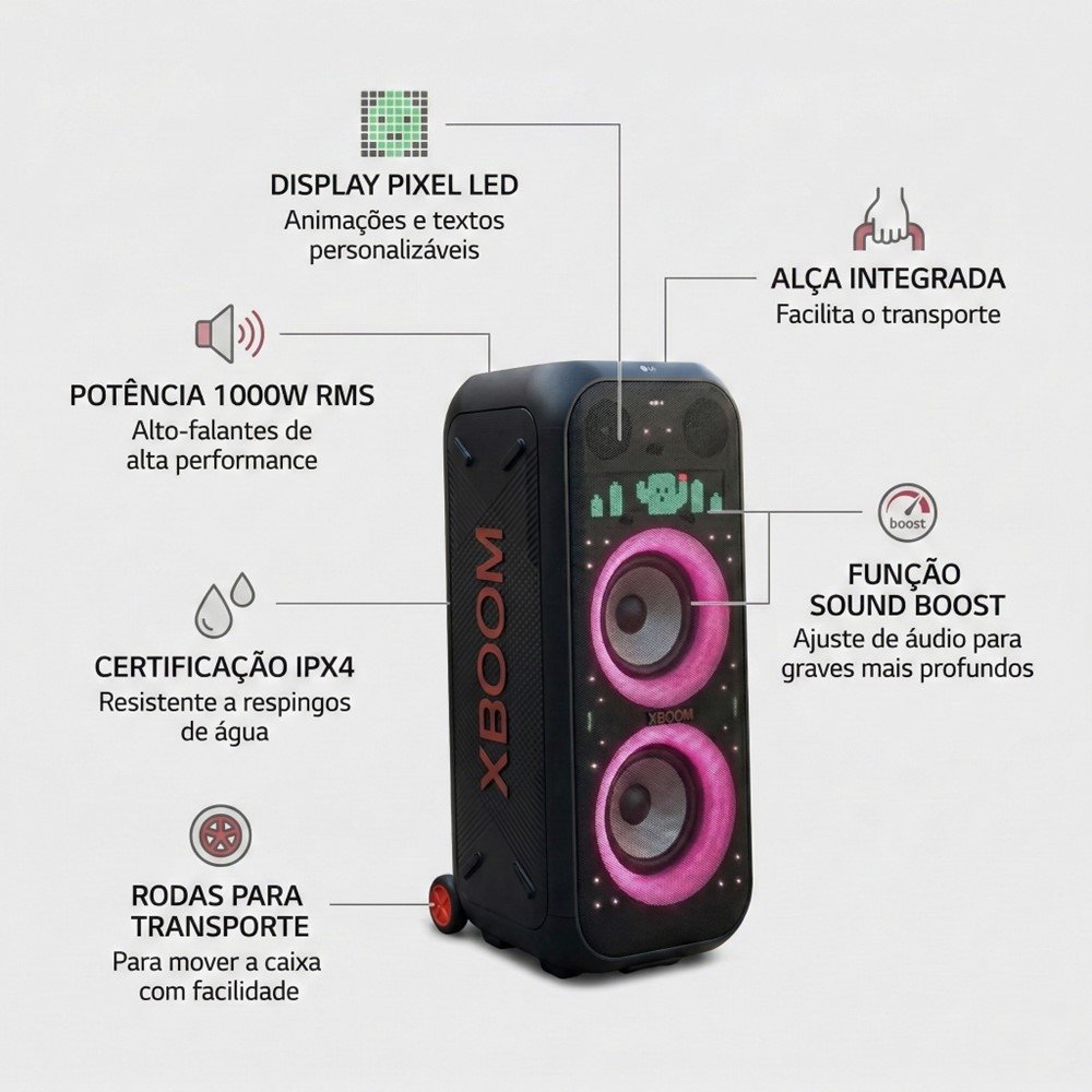 A Caixa de Som LG XBOOM XL9T foi feita para quem quer potência de verdade e presença sonora em encontros, comemorações e momentos de lazer. Com 1000W RMS, ela entrega um som forte e envolvente para preencher o ambiente com mais energia - sem depender de volume no limite para "aparecer".